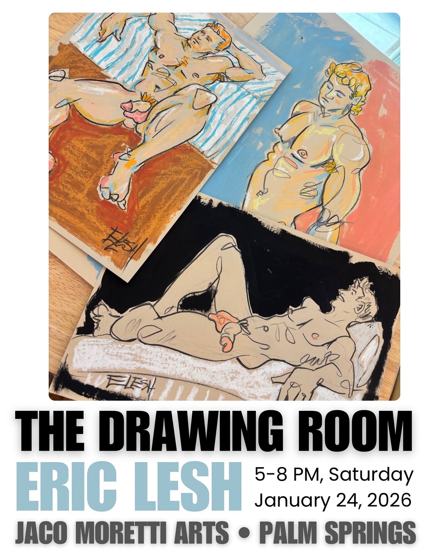 THEN…. The following night, Saturday, January 24, Eric Lesh’s solo exhibition “THE DRAWING ROOM” will open from 5 PM until 8 PM!